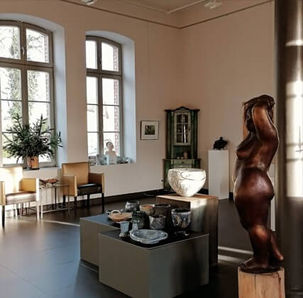 Hochkarätige Werke im klassischen Sinn zeigt die Galerie Teterow mit den Künstlern Wolfgang Friedrich und Falko Behrendt. Der aus Sachsen stammende Bildhauer Wolfgang Friedrich sieht seine Arbeit als Gratwanderung hin zur eigenen Mitte und die Welt als Modell, in dem das Auge lange umherwandern kann, ohne anzukommen. Seine Kunst lässt sich als Vergegenwärtigung des antiken Erbes auf dem Horizont heutiger Erfahrung beschreiben. Der heute in Rostock lebende Friedrich verwendet Materialien wie Wachs, Gips, Ton u.a. für Terrakotten und Bronze. Blei- und Kupferbleche, Stein, Stahl, auch als Fundstücke, ergänzen die Arbeiten. Zeichnung und Radierung begleiten das plastische Werk.